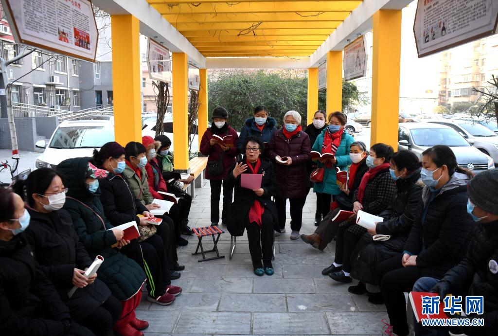 2020年12月22日,河北省石家庄市裕华区建南社区年过八十的党员靳国芳为社区居民宣讲党的十九届五中全会精神。新华社记者 王晓 摄