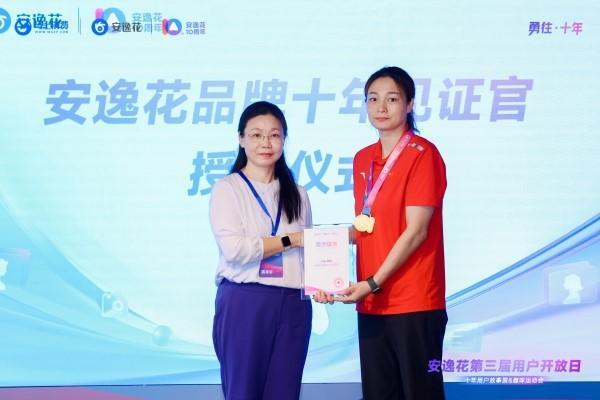 图注:马上消费总经理郭剑霓为摔跤奥运冠军王娇颁发安逸花品牌十年见证官身份徽章 摄影:安安