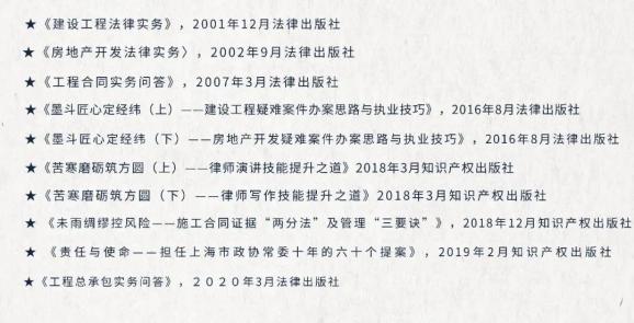 主编或与他人合著作品有《工程建设合同与索赔管理》《住宅商品房交易与物业管理案件评析及法律实务》《法院审理建设工程案件观点集成》《法院审理房地产案件观点集成》等,均深得业内人士和广大读者的好评。