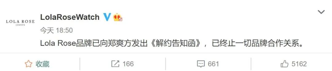 腕表品牌Lola Rose官博删除了有关郑爽的一切内容,曾拍摄过的杂志《时尚芭莎》和《周末画报》官博也删除了郑爽的封面内容。