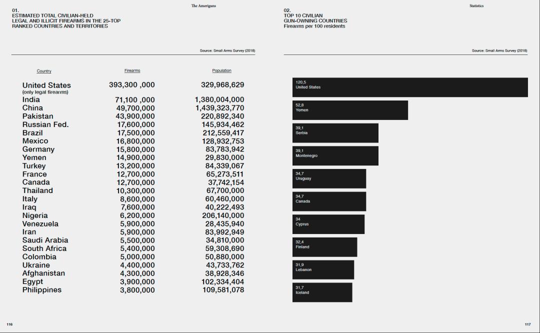 左页为合法拥有的枪支器械(估计)总量全球排名与各国总人口,右页为排名前十国家之每百人拥有枪支器械量,数据来自Small Arms Survey,是瑞典日内瓦国际发展研究部成立的独立研究项目。