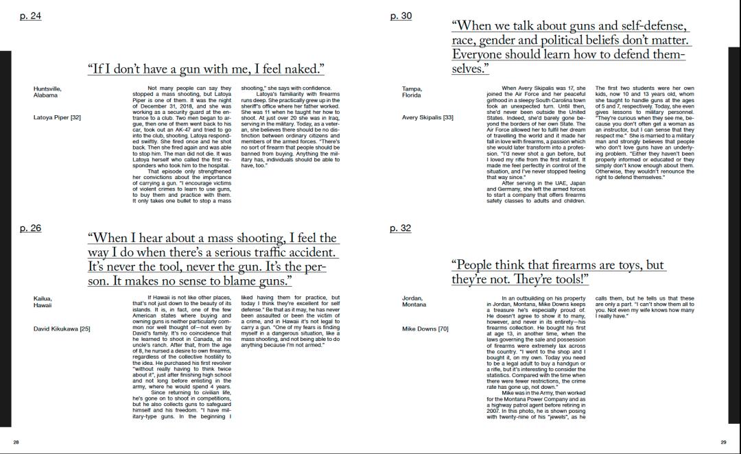 然而,私人非法买卖武器却可以暗渡陈仓。人们通过私人买卖、遍布全美的枪支秀(假杂志旧文《我的名字叫努尔·穆罕默德·汗》中的努尔,便旅居阿富汗及伊拉克,搜罗战争遗留的枪械出口到美国,大多即在枪支秀上售卖),可以轻易购得武器。2015年美国一起枪杀案凶手就没有通过联邦调查局的武器购买资格审核,但他依然搞到了枪,并且在教堂里结束了九个黑人的生命。在Instagram上搜索#guns、#firearms、#freedomguns等相关标签,有上百万张关联图片,Galimberti亦将这些图片与网络居民的评论以现象素材加入书中。