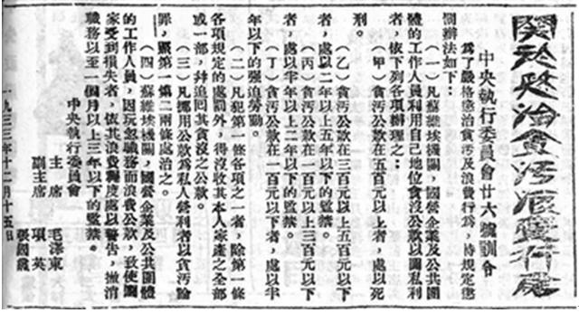 法纪如山,利剑高悬。在中华苏维埃共和国最高法院旧址陈列室,悬挂着1933年12月中华苏维埃共和国临时中央政府执行委员会发布的《关于惩治贪污浪费行为》第26号训令的图片:“苏维埃机关、国营企业及公共团体的工作人员利用自己地位贪污公款以图私利者,贪污公款500元以上,处以死刑;贪污公款300元以上500元以下,处以二年以上五年以下监禁……这是中国共产党成立以来颁布的第一部完整的以反贪污反浪费为主要内容的法律文献。