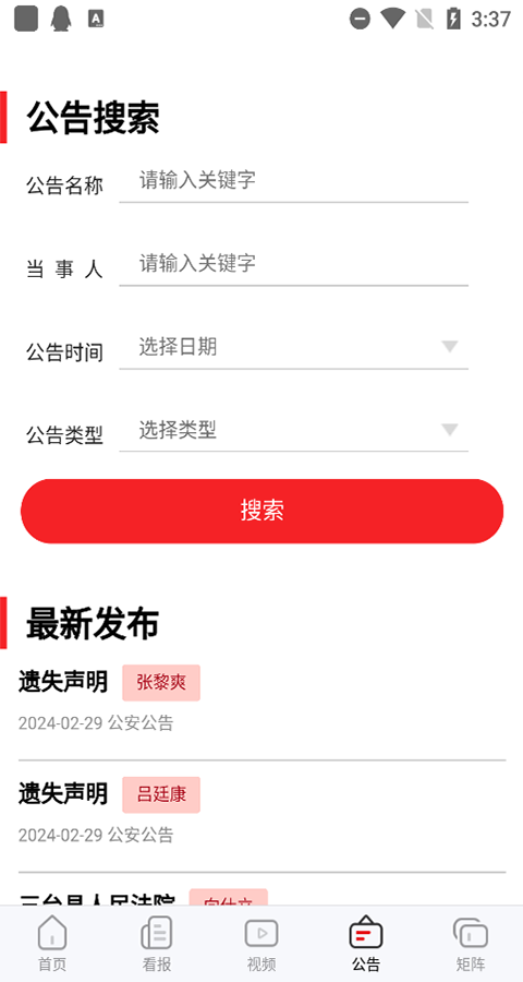 天平发布app中国法院网是一款线上法院查询软件,用户可以在app中查询到法院发布的真实公告,正在进行法律业务的用户可以在app中发布公告还能了解公告的后续发布情况,如果是公司业务还能申领发票进行报销,软件界面简洁使用方便,能够查询的信息都法院发布的真实正确的信息。