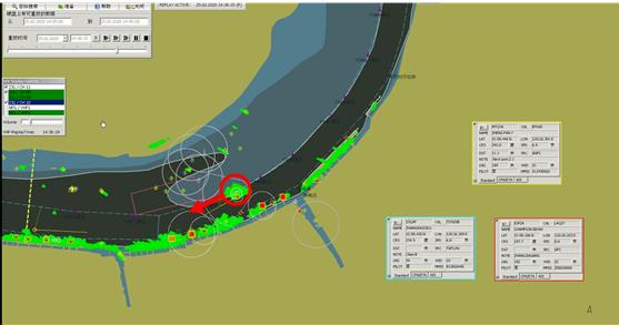 本起事故发生在转向角达约110度的福姜沙南水道弯曲航段,事发时为涨潮时段,受航道深泓走势的影响,存在大范围的压岸水流区域。该轮重载在深水航道航行过程中,船体与水流方向存在一定的夹角,涨潮期间,上行大型重载海轮右舷受流压作用易造成船舶向左偏转。