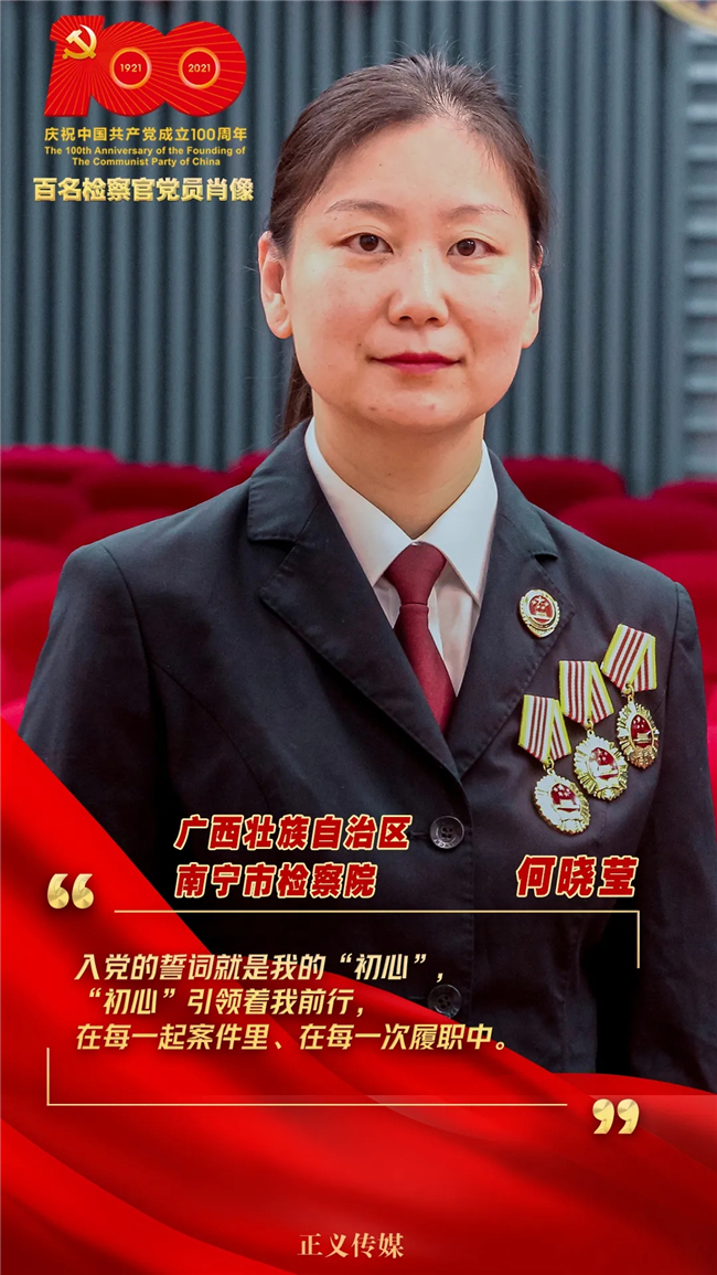 何晓莹带领团队办理的雷锋英烈权益保护案被写入最高检工作报告,办理的农资废弃污染公益保护案入选最高检公益诉讼检察典型案例。她先后荣立二等功1次、三等功4次,获得全国民行检察优秀办案人、自治区检察业务专家、南宁市三八红旗手、市直机关优秀党务工作者等称号,入选全国民事行政检察人才库、全国公益诉讼检察人才库。