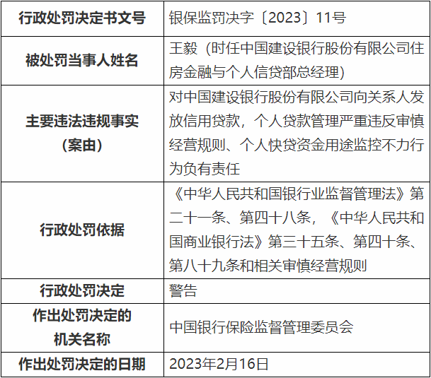 王毅时任建设银行住房金融与个人信贷部总经理,对建设银行向关系人发放信用贷款,个人贷款管理严重违反审慎经营规则、个人快贷资金用途监控不力行为负有责任。