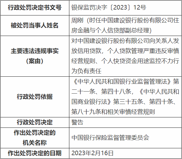 周刚时任建设银行住房金融与个人信贷部副总经理,对建设银行向关系人发放信用贷款,个人贷款管理严重违反审慎经营规则、个人快贷资金用途监控不力行为负有责任。