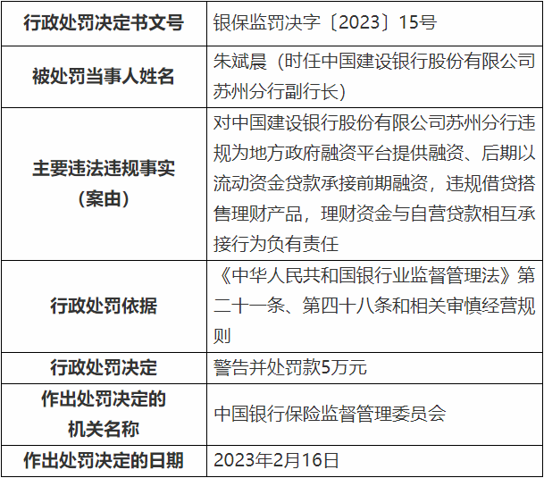 朱斌晨时任建设银行苏州分行副行长,对建设银行苏州分行违规为地方政府融资平台提供融资、后期以流动资金贷款承接前期融资,违规借贷搭售理财产品,理财资金与自营贷款相互承接行为负有责任。