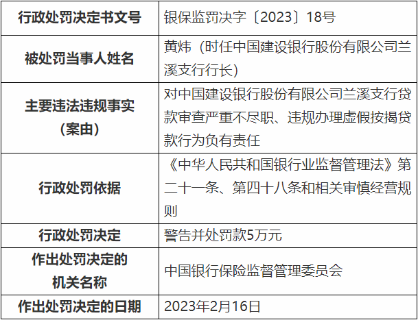 黄炜时任建设银行兰溪支行行长,对建设银行兰溪支行贷款审查严重不尽职、违规办理虚假按揭贷款行为负有责任。