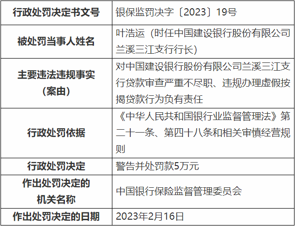 叶浩运时任建设银行兰溪三江支行行长,对建设银行兰溪三江支行贷款审查严重不尽职、违规办理虚假按揭贷款行为负有责任。