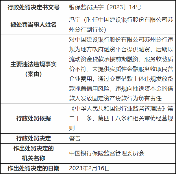 冯宇时任建设银行苏州分行副行长,对建设银行苏州分行违规为地方政府融资平台提供融资、后期以流动资金贷款承接前期融资,服务收费质价不符、未提供实质性金融服务收取民营企业费用,通过变更借款主体违规发放贷款掩盖信用风险,违规向抽逃资本金的借款人发放固定资产贷款行为负有责任。