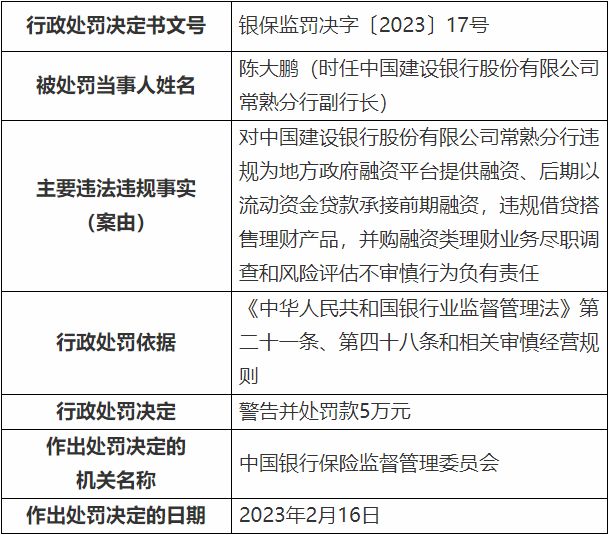 陈大鹏时任建设银行常熟分行副行长,对建设银行常熟分行违规为地方政府融资平台提供融资、后期以流动资金贷款承接前期融资,违规借贷搭售理财产品,并购融资类理财业务尽职调查和风险评估不审慎行为负有责任。