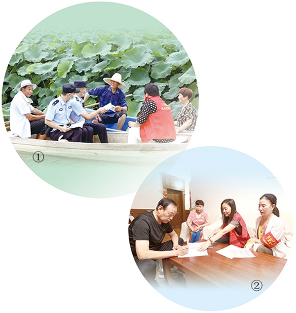 图①:江苏扬州宝应县公安局民警和当地网格员为村民调解民事纠纷。 沈冬兵摄