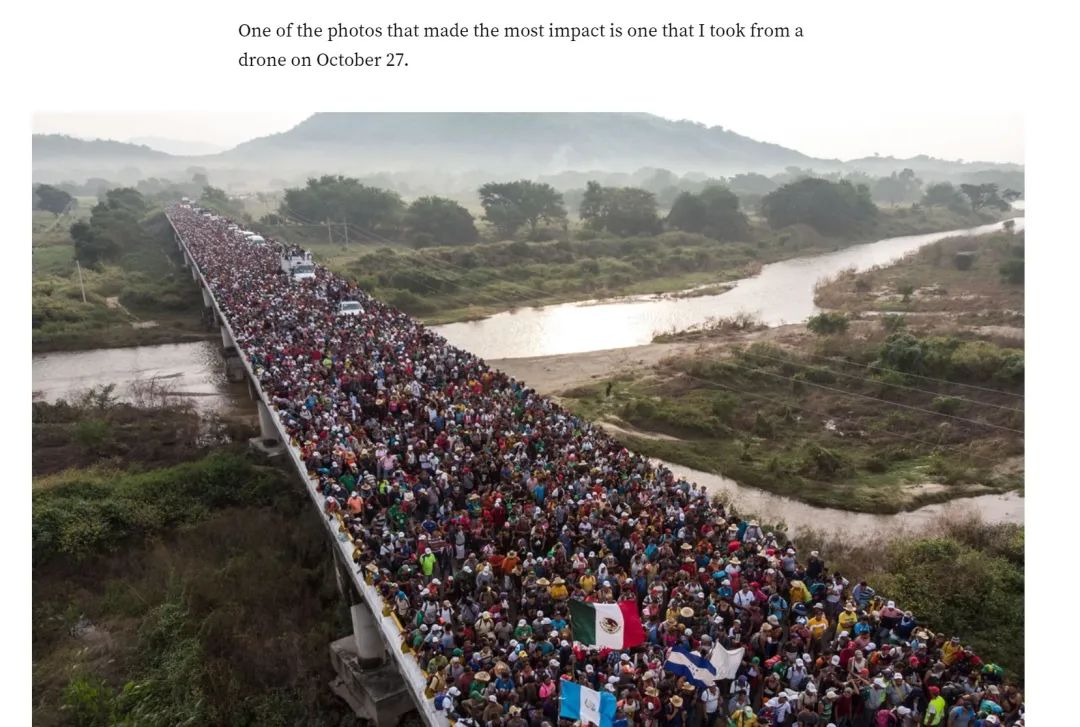 在谷歌对网传图片进行反搜,该图在今年5月之前就已经多次出现,可以追溯到法新社2019年9月的文章。文中称,法新社摄影师Guillermo Arias对中美洲移民的摄影报道在法国佩皮尼昂新闻摄影节中获得最高奖项,而其作品中影响力较大的图片就包括了该网传图片。根据Guillermo的叙述,原图系无人机拍摄于2018年10月27日,当时大量洪都拉斯移民乘坐大篷车奔赴美国,在前往墨西哥南部城市圣佩德罗塔帕纳特佩克的途中遇到警察封锁道路,因而在此停留了几个小时。