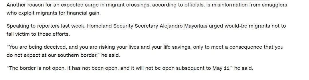 按照美国海关和边境保护局(CBP)的最新数据,自该政策实施以来,当局已在美墨边境驱逐移民超过280万次。据CNN报道,官方信源表示,《第42条法案》到期可能会导致进入美国的移民数量激增。一方面,受到此方案驱逐的移民虽然有希望通过预约申请合法入境美国,但这类预约很难成功,很多移民已经丧失耐心。另一方面,《新闻周刊》5月8日报道指出,一些偷渡组织者会在此期间欺骗无证移民“法案到期后就能随意通过边境”,并以此鼓动他们非法入境。而事实上,美国国土安全部部长Alejandro Mayorkas近期警告称,“边境并没有开放,从前没有开放,在5月11日之后也不会开放。”