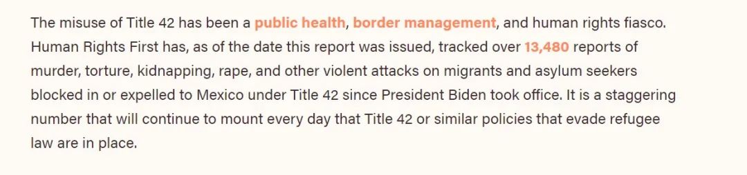 国际人权组织“人权第一(Human Rights First)”认为,“《第42条法案》的滥用是美国公共卫生、边境管理和人权方面的一大败笔。”数据显示,自拜登上任以来,已发现超过13480起绑架、酷刑、强奸或其他针对因《第42条法案》被驱逐到墨西哥的移民的暴力袭击事件。