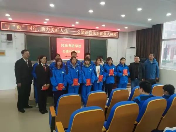 活动中,首先由法庭庭长李五为与会的学生代表开展一场题为《与“典”同行,助力美好人生》的专题讲座。李庭长从民法基本原则、民事权利能力和行为能力等基础内容谈起,为同学们介绍了民法典中与个人成长生活息息相关的重要内容,并通过一个个司法案例将所讲的条文规定与实践相联系,让同学们对民法典的相关知识有更加深入的了解。随后,公道法庭与公道镇司法所相关人员将民法典读本及专门制作的“民法典台历”赠送给学校师生。