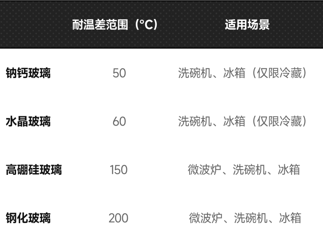 结合材质本身的性质和制造工艺, 4 类玻璃制品的耐温差排名是这样的:钢化玻璃 > 高硼硅玻璃  > 水晶玻璃 >  钠钙玻璃 。