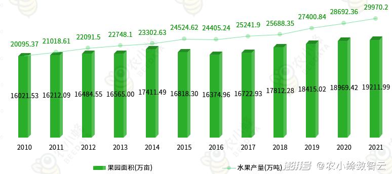 据国家统计局数据显示,2010年以来,受市场需求的拉动以及各项政策的扶持,全国果园面积与水果产量均整体呈正增长态势。2021年底,全国果园面积已近2亿亩,全国水果总产量达29970.2万吨(已近3亿吨),较2010年的20095.37万吨(约合2亿吨)增加了9874.83万吨,增幅达49.14%,年均复合增长率约3.7%,较2020年同比增长4.45%。