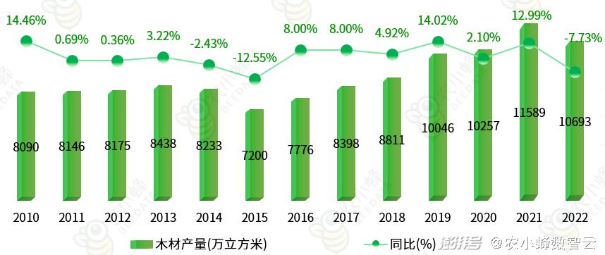 据国家统计局数据显示,2022年,受市场需求波动的影响,全国木材产量10693万立方米,比上年下降7.73%。长期来看,2010~2021年间,全国木材产量整体呈正增长态势,仅在2014年、2015年、2022年有过下降趋势,最小值为2015年的7200万立方米,最大值为2021年的11589万立方米,2019年以来,生产规模已连续4年在1亿立方米以上波动。