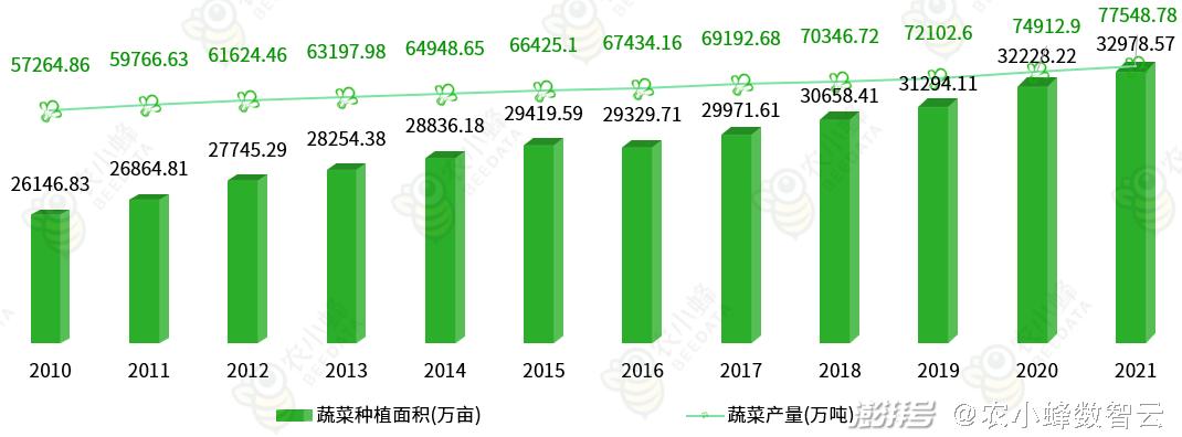 从产量来看,2010年~2021年,中国蔬菜产量持续正增长,得益于国内育种水平以及高产水平的提升,在种植面积呈下降趋势的2016年,中国蔬菜产量仍呈正增长态势。2012,中国蔬菜产量开始突破6亿吨;经过6年的发展,2018年开始突破7亿吨;2021年,全国蔬菜产量已增至77548.78万吨(约合7.75亿吨),较2010年的57264.86万吨(约合5.73亿吨)增加了20283.92万吨(约合2.03亿吨),增幅达35.42%,年均复合增长率约2.79%,较2020年同比增长3.52%。