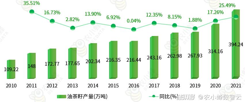 据国家统计局数据显示,2010~2021年间,在2009年国家林业局颁布的《全国油茶产业发展规划(2009~2020年)》、2020年国家林业和草原局发布的《油茶产业发展指南》等支持油茶产业发展的配套政策扶持下,全国油茶籽产量由109.22万吨连增11年至394.24万吨,近11年间增量约285.02万吨,增幅约160.96%,年均复合增长率约12.38%;2021年同比增幅约25.49%。