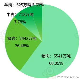 据国家统计局数据显示,中国肉类常年保持“猪肉>禽肉>牛肉>羊肉”的产量结构。以2022年数据为例,全国肉类总产量为9227万吨,其中,猪肉产量5541万吨,在肉类总产量中比重约60.05%;禽肉产量2443万吨,在肉类总产量中比重约26.48%;牛肉产量718万吨,在肉类总产量中比重约7.78%;羊肉产量525万吨,在肉类总产量中比重约5.69%。