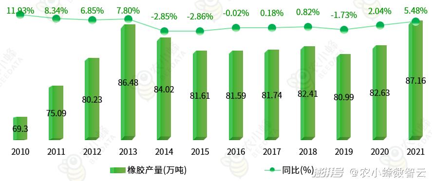 据国家统计局数据显示,2010~2013年,随着橡胶开割面积的增加,全国橡胶产量由69.3万吨逐年增长至86.48万吨,2014~2015年受产业结构调整的影响,全国橡胶产量连降两年至81.61万吨,2015~2020年间,全国橡胶产量趋于稳定,整体在81万吨左右波动,同比增长率在±3%以内,2021年,随着国内外汽车表观消费不断增长,带动了轮胎产业快速发展,橡胶需求量增加,进一步拉动了橡胶产业的发展,橡胶产量增长至87.16万吨,同比增幅约5.48%。