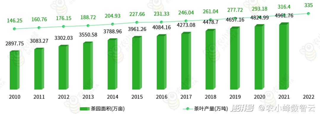 中国茶叶产量随种植面积同步呈现逐年增长态势,年增幅在1.61%~11.09%之间不等。从关键时间节点来看,2011年,全国茶叶产量开始超过150万吨;2014年,开始超过200万吨;2018年,开始超过250万吨;2021年,全国茶叶产量突破300万吨,具体规模为316.4万吨,较2020年同比增加7.92%;2022年已达335万吨,较2021年同比增加5.88%——对比之下,增速有所放缓。