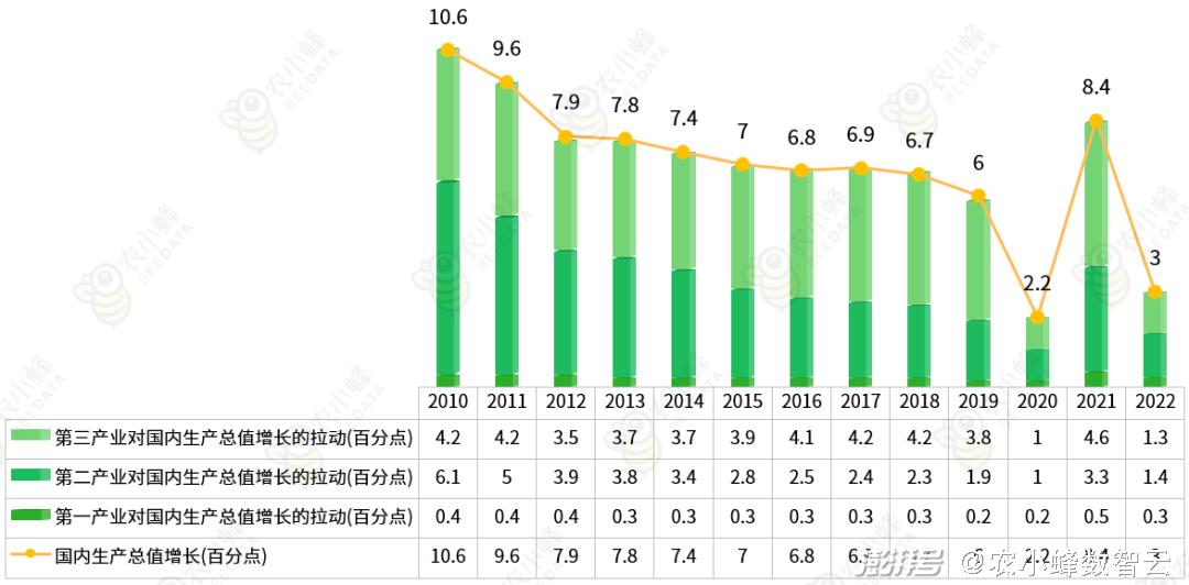 结合国家统计局关于“三次产业对国内生产总值增长的拉动”相关统计,2010~2022年间,中国国内生产总值(GDP)增长百分点在波动下降,年增长百分点在2.2~10.6之间不等,第二产业、第三产业对国内生产总值增长的拉动也呈现波动下降趋势,且波动幅度相对较大;第一产业对国内生产总值增长的拉动百分点相对较低,但也相对稳定,每年的拉动百分点在0.2~0.5之间不等。