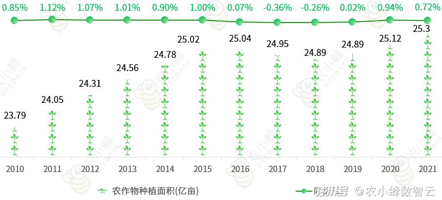 据国家统计局数据显示,2010年~2016年,中国农作物总种植面积呈逐年增长态势,并于2011年开始超过24亿亩,2015年开始超过25亿亩,目前峰值为2021年的25.3亿亩;因种植业高度依赖土地资源,预计后期农作物总种植面积仍将稳定在25亿亩左右。