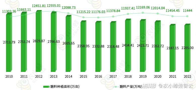 据国家统计局数据显示,2010年以来,全国糖料种植面积与产量波动下降,整体趋稳态势明显。2022年,全国糖料种植面积为2205万亩,产量为11444万吨,同比分别较2010年下降508.79万亩、140.64万吨。