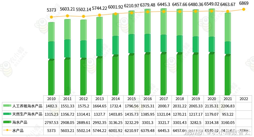 据国家统计局数据显示,2022年,全国水产品产量6869万吨,比上年增长2.7%。其中,养殖水产品产量5568万吨,增长3.2%;捕捞水产品产量1301万吨,增长0.4%。