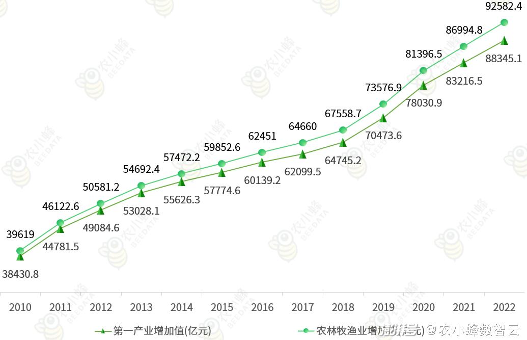 据国家统计局数据显示,2010年以来,全国“第一产业增加值、农林牧渔业增加值”均呈现逐年增长态势。其中,“第一产业增加值”由2010年的38430.8亿元(约合3.84万亿元)逐年增长至2022年的88345.1亿元(约合8.83万亿元),近12年间增量约49914.3亿元(约合5万亿元),增幅约129.88%,年均复合增长率约7.18%;“农林牧渔业增加值”由2010年的39619亿元(约合3.96万亿元)逐年增长至2022年的92582.4亿元(约合9.26万亿元),近12年间增量约52963.4亿元(约合5.3万亿元),增幅约133.68%,年均复合增长率约7.33%——增速整体高于“第一产业增加值”,意味着“农林牧渔服务业增加值”也在稳步增长。
