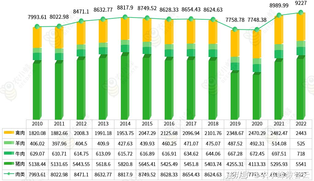 据国家统计局数据显示,2010年以来,受草地资源的限制以及猪周期、非洲猪瘟等因素的影响,全国肉类产量在2010~2020年间先增后降,2021年在前期市场价格及需求的拉动下,生猪产能恢复,牛肉、羊肉、禽肉的上市量及产量也有不同程度的增加。2022年全国肉类产量回升至9227万吨——为近12年来的峰值,同比较2021增加了237.01万吨,增幅约2.64%。