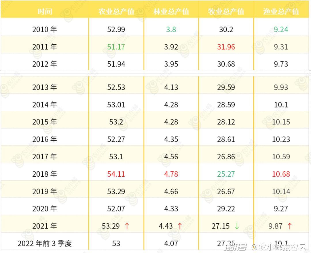 国家统计局数据显示:2010年以来,全国农林牧渔业总产值常年保持“农业总产值>牧业总产值>渔业总产值>林业总产值”的结构。其中,农业总产值在农林牧渔业总产值中所占比重常年在51%以上;牧业总产值在农林牧渔业总产值中所占比重常年在30%左右波动;渔业总产值在农林牧渔业总产值中所占比重常年在10%左右波动;林业总产值在农林牧渔业总产值中所占比重常年在4%左右波动。