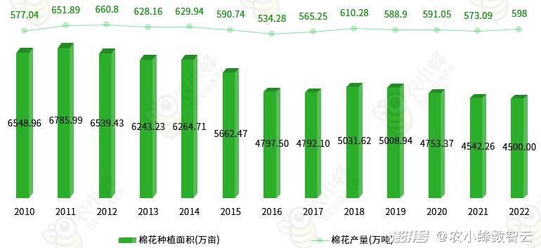 据国家统计局数据显示,2010年以来,受农业产业结构调整以及市场需求变动的影响,全国棉花种植面积整体呈波动下降趋势,从最新时间段来看,2020~2022年,全国棉花种植面积已连降3年;产量则得益于单产水平的提升以及科技的进步,整体稳定在600万吨左右。