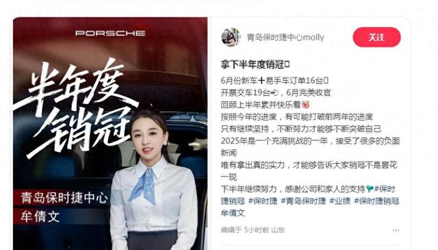 近日,青岛保时捷中心女销售牟倩文在社交平台发文称,拿下2025年半年度销冠。按照今年的进度,很有可能打破前两年成绩。