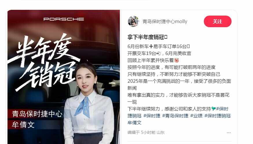 近日,青岛保时捷中心女销售牟倩文在社交平台发文称,拿下2025年半年度销冠。按照今年的进度,很有可能打破前两年成绩。