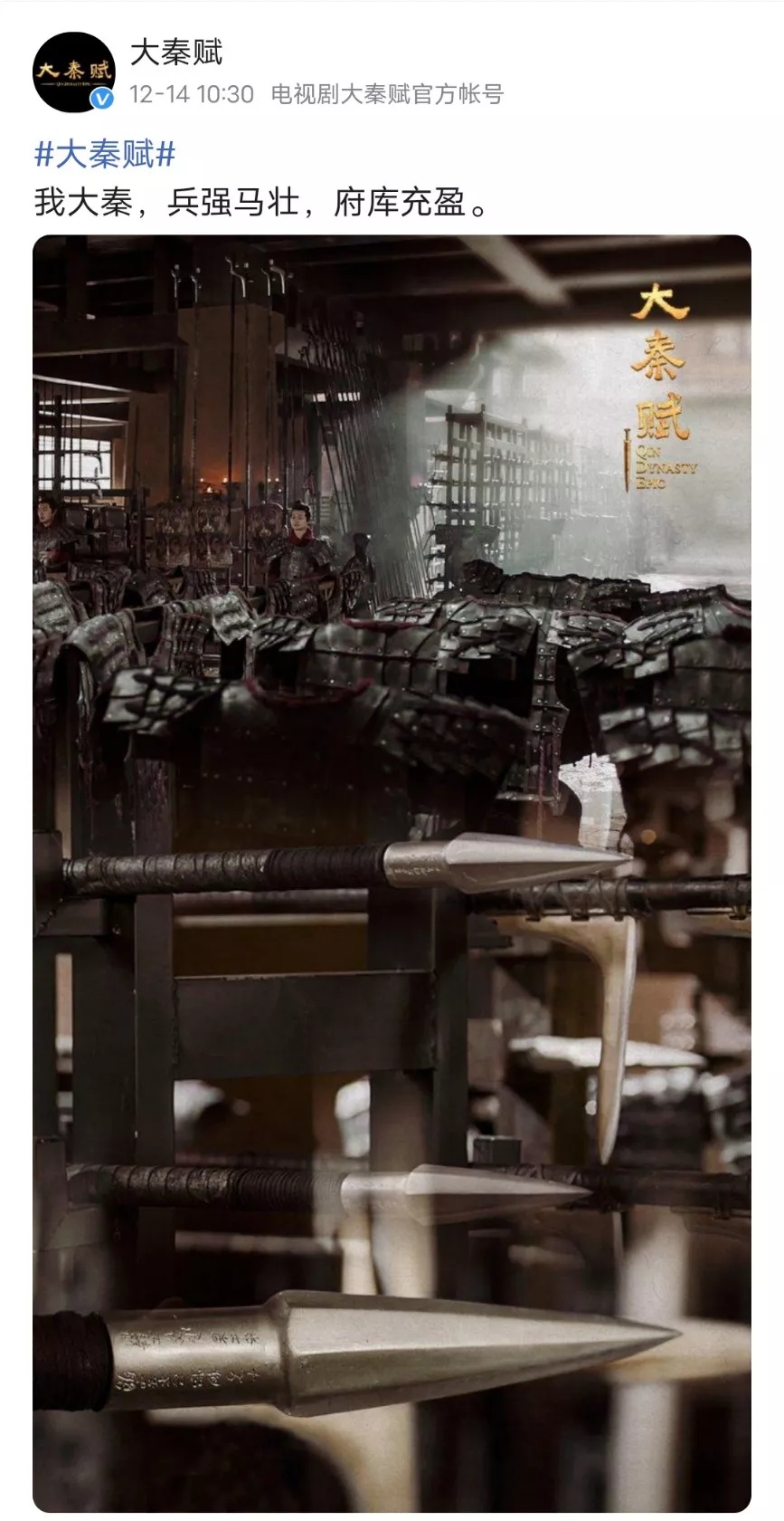 14日,《大秦赋》官方账号放出上面这张图。一方面强调了大秦军队精良的装备,另一方面也展示出了,《大秦赋》在场景布置,和道具服装上的匠心制作。