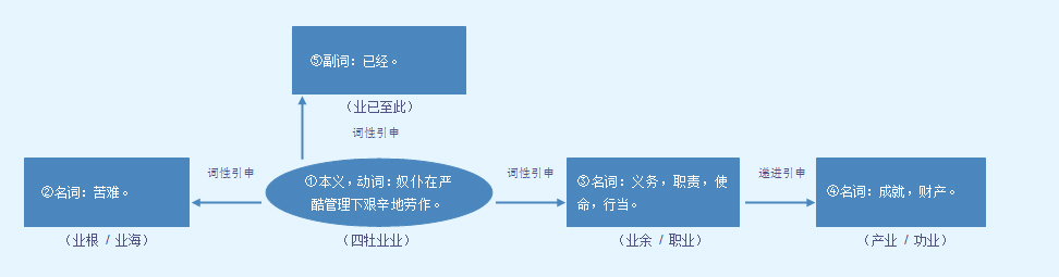 ③名词:义务,职责,使命,行当。  业绩 业务    业余    业主    业精于勤  /  毕业 卒业    创业 立业    大业    副业 正业    工业