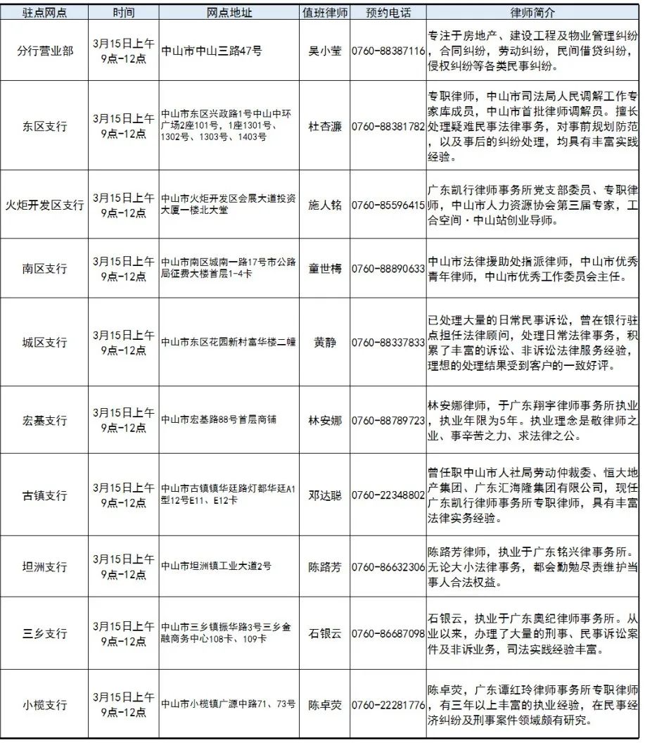 3月15日上午9:00-12:00,中山市法律援助处联合建行中山市分行在建行十个网点开展3•15“港湾卫士•与法同行”消费者权益保护宣传活动。