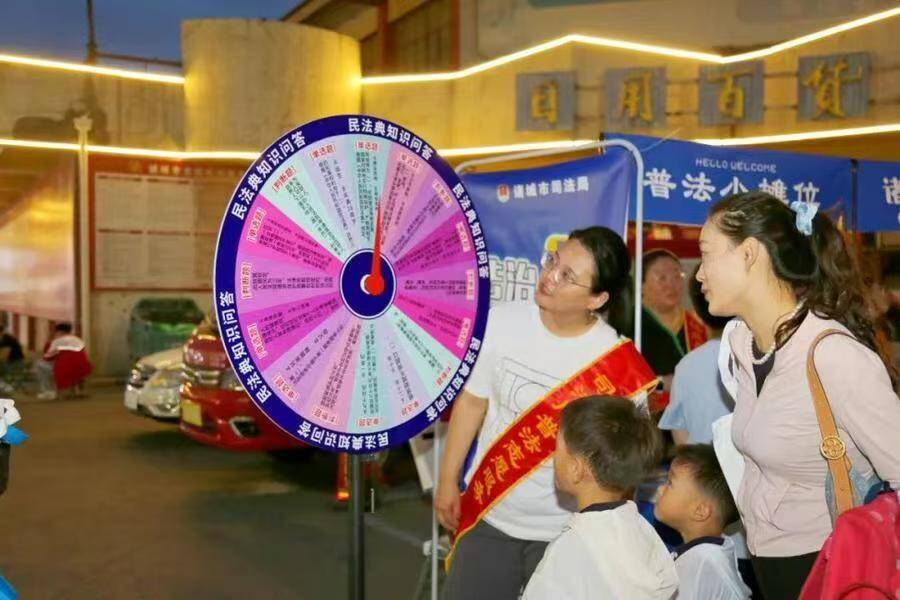 就在这热闹非凡的夜市氛围中,一场别开生面的“法治夜市”悄然拉开帷幕。活动现场,普法宣传区热闹非凡。工作人员和律师向诸城市民发放民法典、法律援助指南等资料,不少人驻足翻阅、咨询,将实用法律知识“打包带走”。