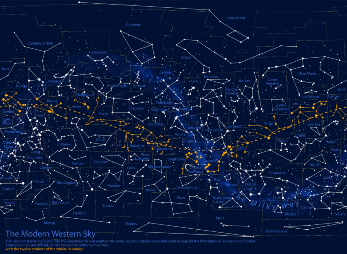 白羊座 (Aries)、金牛座 (Taurus)、双子座 (Gemini)、巨蟹座 (Cancer)、狮子座 (Leo)、室女座 (Virgo)、天秤座 (Libra)、天蝎座 (Scorpius)、蛇夫座(Ophiuchus)、人马座 (Sagittarius)、摩羯座 (Capricornus)、宝瓶座 (Aquarius)、双鱼座 (Pisces)(注:以上名词按照现代天文学对星座区域的划分以及我国的天文学名词规范列出)