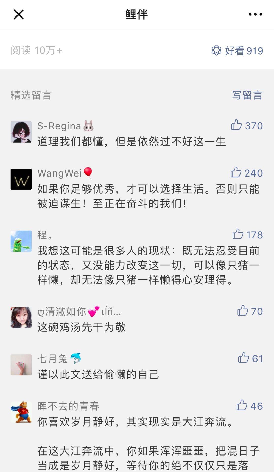 总体上看,虽然是一篇价值观正确、素材充分但不新鲜的励志鸡汤文。但踩点处处正确,行文层层递进,容易引起共鸣,易于阅读,精准把握了在经济萎靡大环境下人们的情感诉求——求安慰求鼓舞。