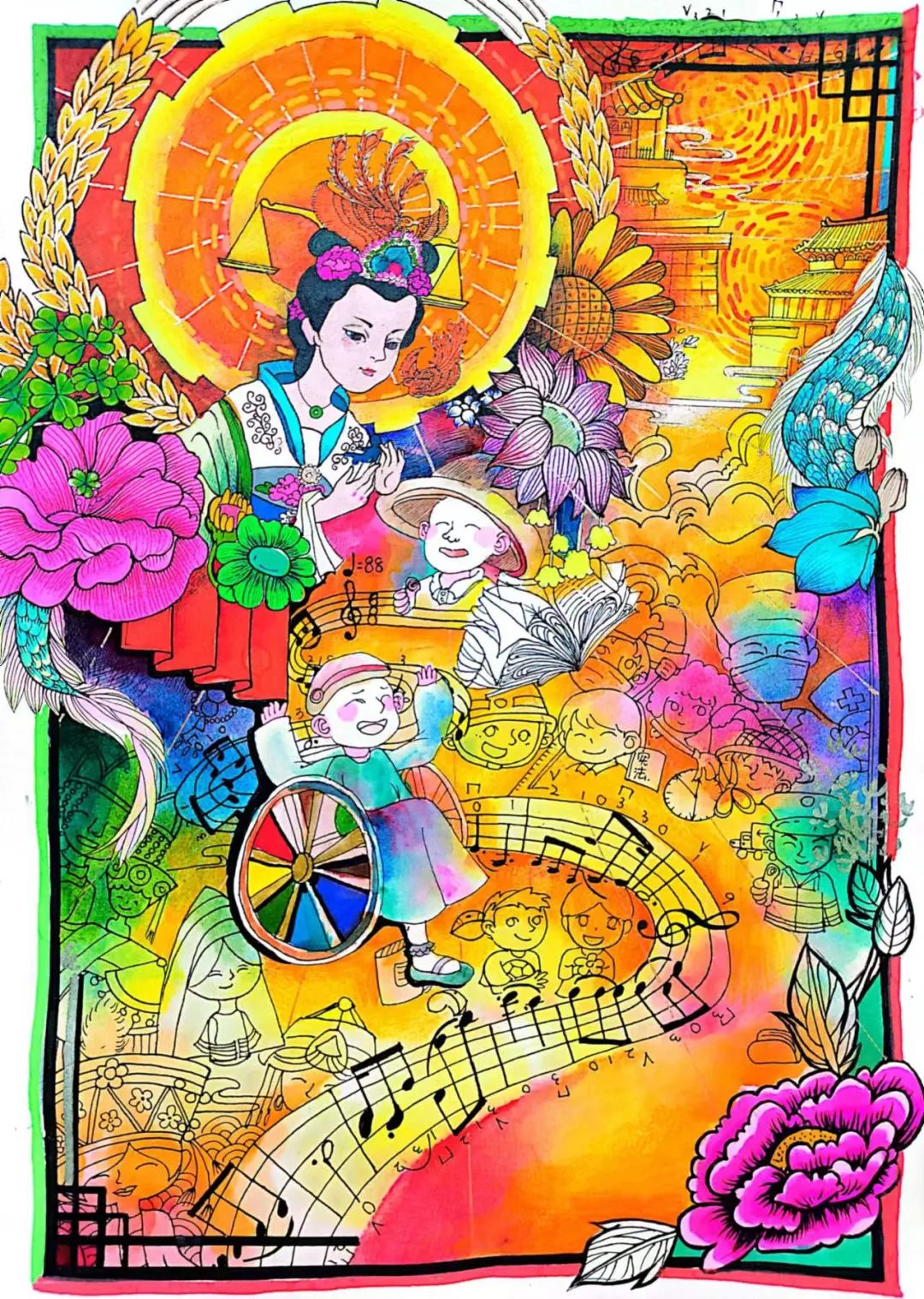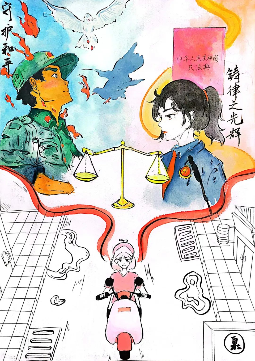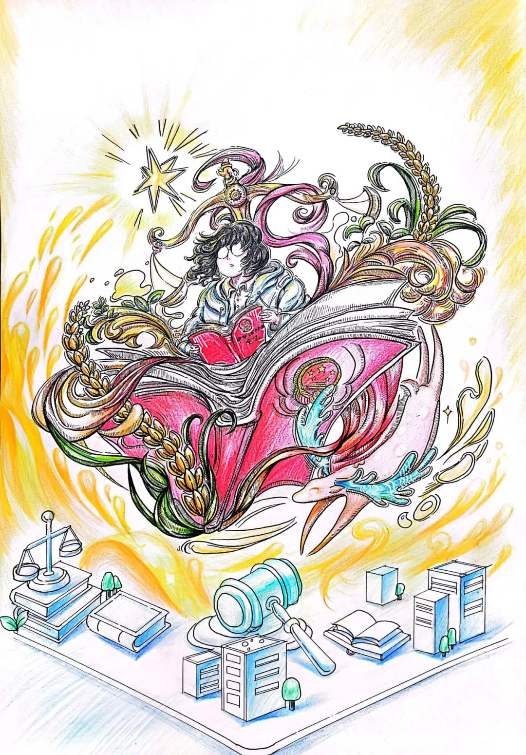 古有神话中的九天玄女象征着正义之神,今有以宪法为母法的中国特色法治社会,画中以明艳的色彩以示丰登。疾风暴雨总要离场,乌云背后藏着艳阳,法治的光辉普照形色匆匆的人群,法治的音符携着长风而来,予祖国的花朵们一个更加朝气向阳的未来。