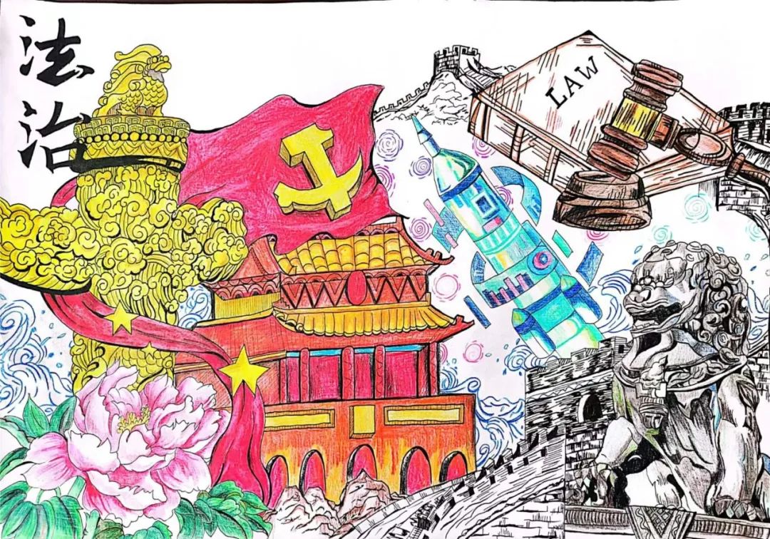 法治是治国之本,在党的领导下,我国的法治建设取得了巨大的成就,五星红旗飘扬于空中,天安门闪耀于阳光之下。作品中新时代的青少年遵法守法向国旗敬礼。公检法严厉打击违法犯罪,军人护卫祖国安全,共同为人民创造更美好的未来!