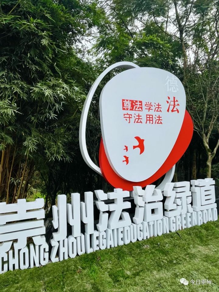 在入口绿化带醒目处,设有“法安天下,德润人心”中英文双语标识牌,彰显法治绿道宣传主题。