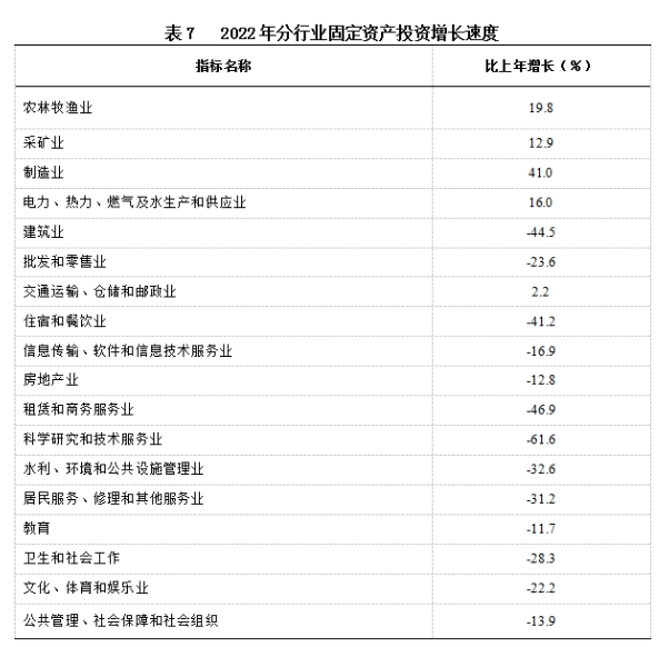 全年固定资产投资[16]比上年下降7.6%。按产业分,第一产业投资增长19.8%,第二产业投资增长21.5%,第三产业投资下降22.3%。工业投资增长21.6%。